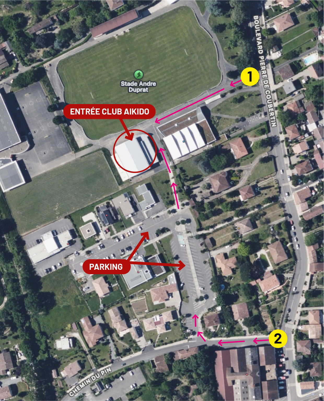 Point 2 (celle que nous conseillons) : entrée par le chemin du Pin, accès au parking (nombreuses places disponibles), puis suivre le chemin vers le stade de Rugby.